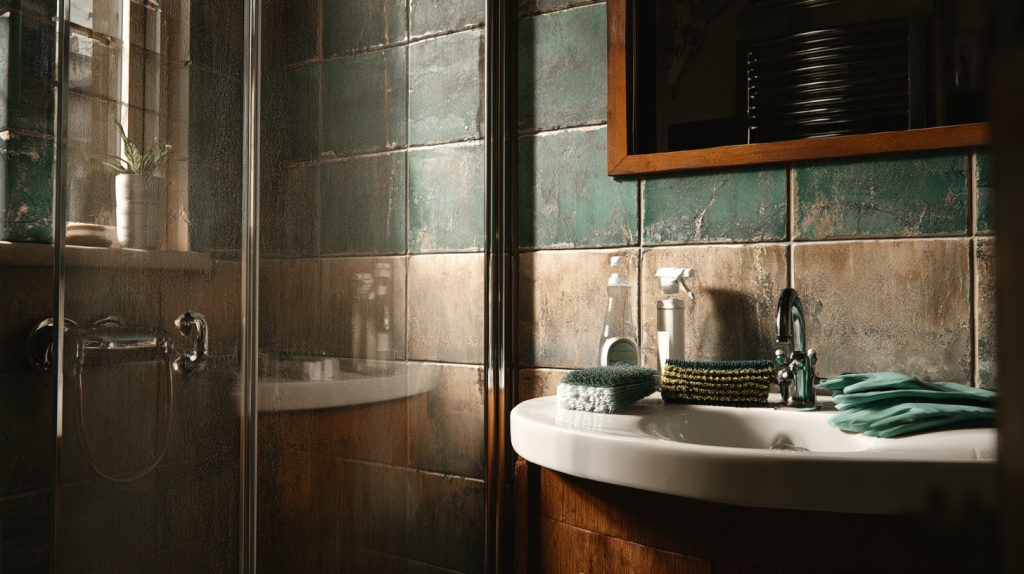 Bathroom deep cleaning focus: descaling taps and shower screens, toilet sanitisation, mould treatment in grout and silicone seals, scrubbing tiles, mirror polishing, and full disinfection of floors and surfaces.